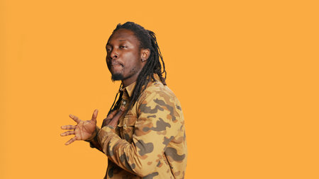 African American man with a modern and stylish haircut exudes confidence and charisma as he strikes a pose against an orange backdrop, showcasing a bold and vibrant expression of contemporary fashion and individuality