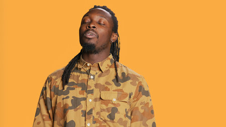 Male model inhaling and exhaling in studio, showing breathing exercises for wellbeing over orange background. Young athletic adult taking breaths and relaxing on camera. Handheld shot.