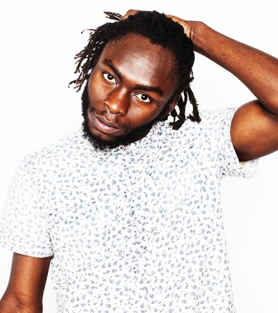 Young handsome african american man with an afro hairstyle. Portrait on white background. Guy looking aside.