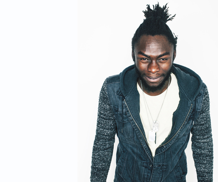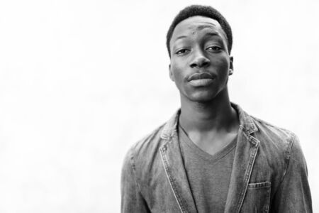 Portrait of a black handsome man outdoor near white background