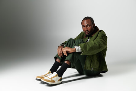 A young man poses elegantly in a vibrant green ensemble, radiating style against a neutral grey background.