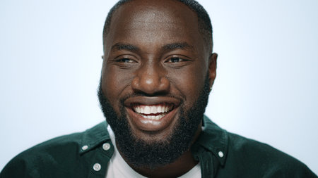 Portrait smiling guy laughing at camera on white background. Closeup happy man posing in studio. Joyful african american model face. Handsome male person have fun in slow motion. Positive emotion