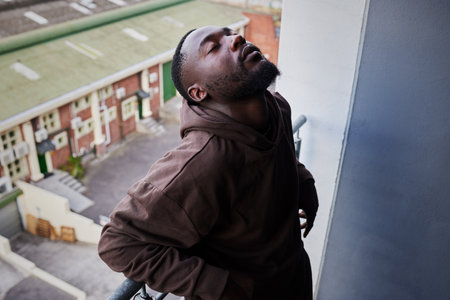 Depression, mental health and anxiety for sad man suffering from life problem stress on balcony of home apartment. Depressed black person face with negative mindset, pain and frustrated over failure