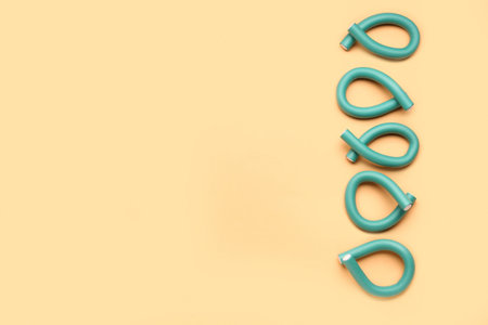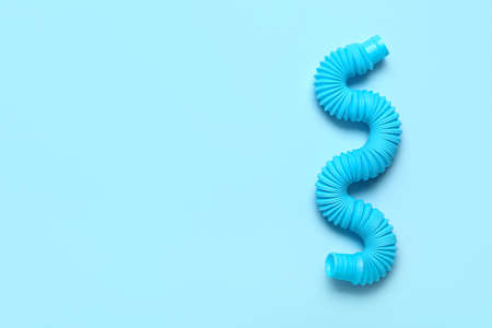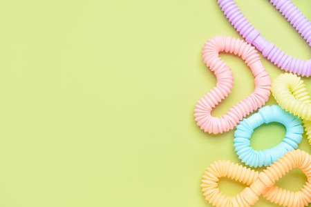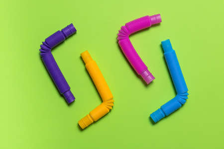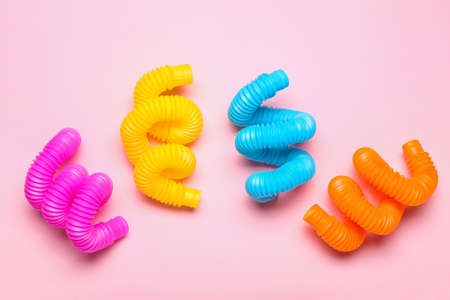 Multi-colored corrugated plastic pipes on a bright background. Popular poptube game in the form of simple shapes and winding lines on a colorful background