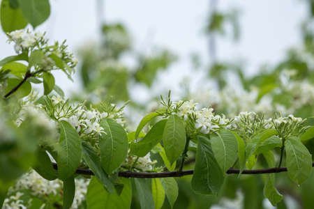 Green bushes with white flowers, blooming flowers