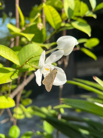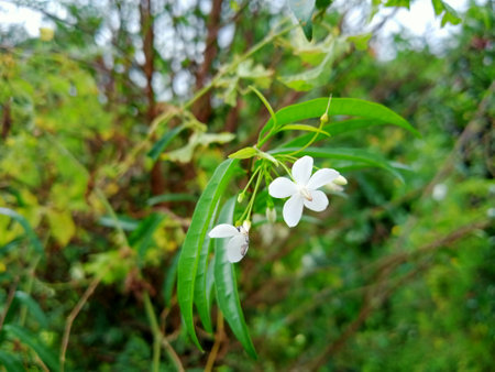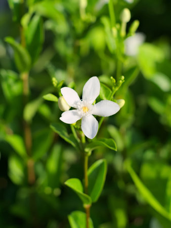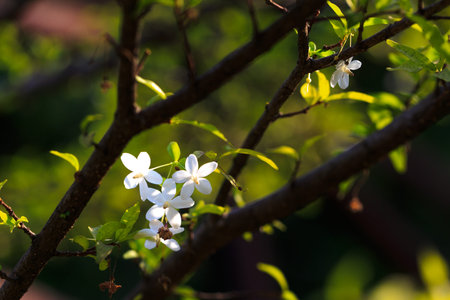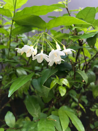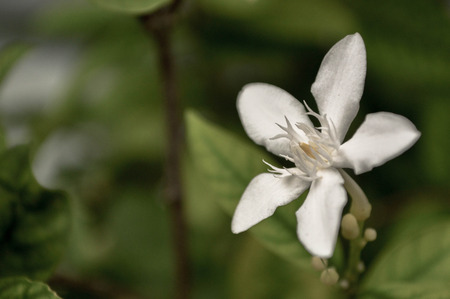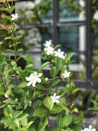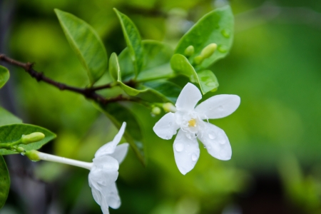 white flower of water jasmine on branches with light shading reflect with side in home garden