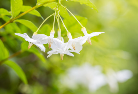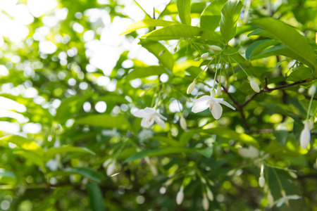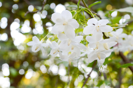 white jasmine flowers blooming and sunlight in garden.