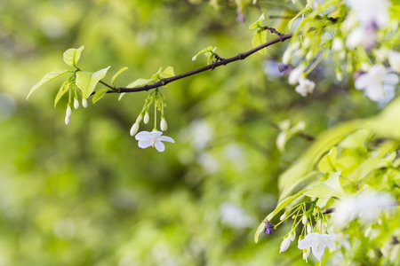 tree brunch with white flower on the bokeh of leaf background