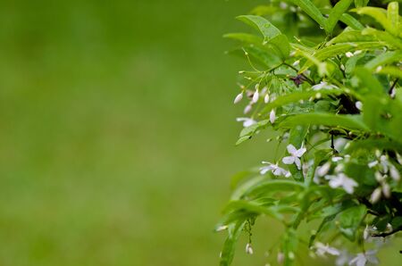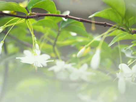 Soft focus of small white flowers with green leaves on blurred background.