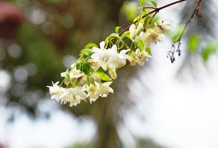 Branches of beauty petite white petals Wrightia flowering bush tree blooming on green leaf background, fragrant plant in a garden under blurred blue sky, selective focus image