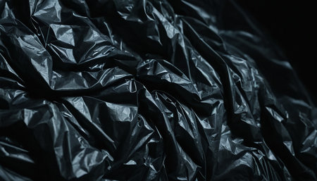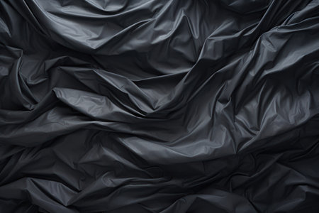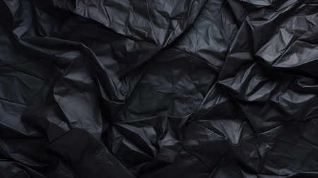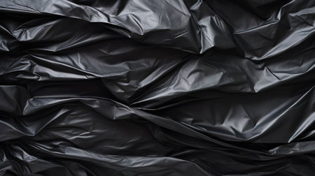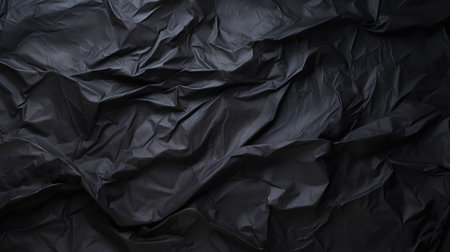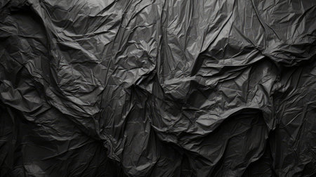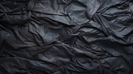 Black wrinkled plastic wrap texture. Crumpled dark thin plastic background. Generative AI.