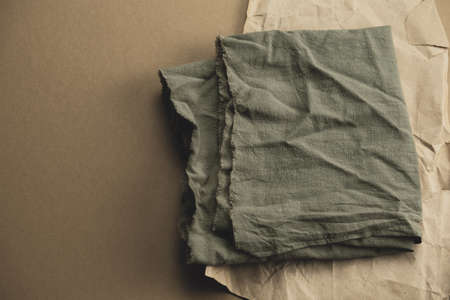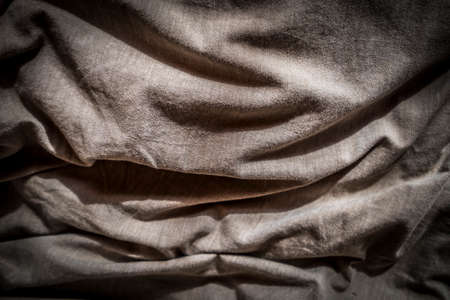 Crumpled fabric texture, dark brown cloth background. Copy space