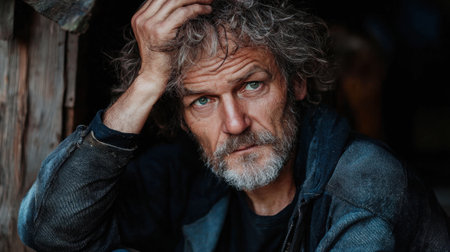 A man with a beard and gray hair is sitting in a doorway. He is wearing a black jacket and a black shirt