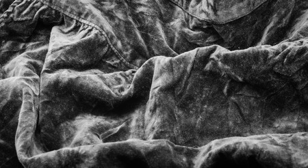 Abstract crumpled darkened black fabric texture background.