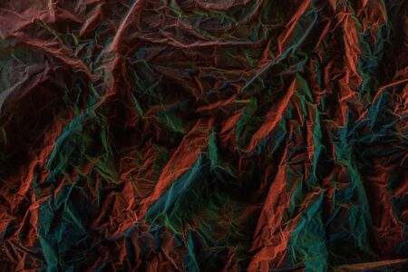 top view of crumpled textured paper with colorful lighting in darkness
