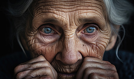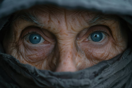 This powerful close-up portrait captures the essence of an elderly woman with striking blue eyes, showcasing her rich facial textures and deep emotions.