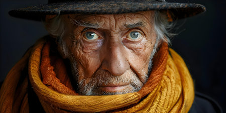 Senior woman with gray hair and deep-set eyes, adorned in an orange scarf, looks directly at the viewer, conveying a sense of wisdom and introspection, AI generated