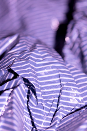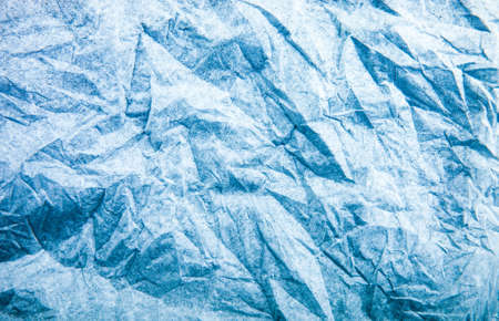 Abstract real paper surface background. Aluminum Platinum Silver foil. Wrinkled crumpled folds bend crush crease kink. Crystal, polygonal texture wave futurism 80s retro style new year. Blue tone