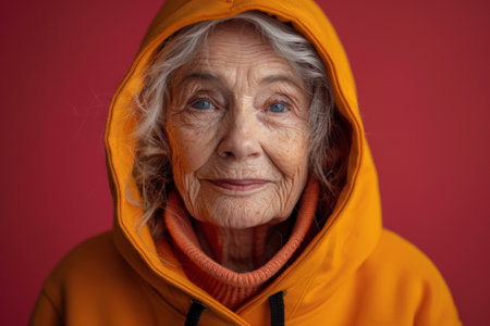 A close-up portrait of a Caucasian older woman wearing a bright yellow hoodie. Created with Generative AI