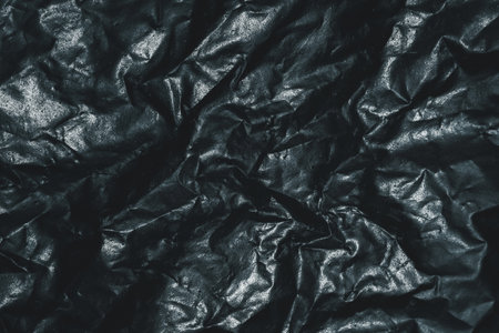 Dark crumpled plastic surface with glossy folds, abstract texture background for industrial, grunge, dramatic and modern design concepts