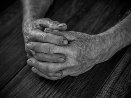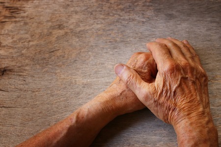 Senior hands on old wooden background