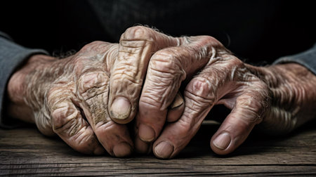 close up of elderly male hands on wooden table