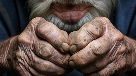 Dirty hands of an elderly man crossed, hands of a farmer at rest