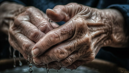 Close-up photo of elderly hands with water droplets, capturing the beauty and texture of aging skin.
