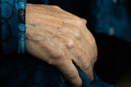 Old wrinkle hands of 93 years old lady, close up, selective focus, series of high resolution photos