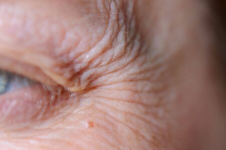 Close-up details of the crows feet and wrinkled skin around the eye