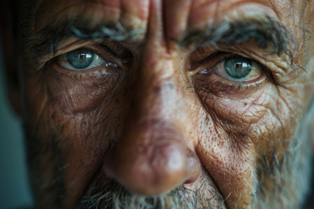 The intricate lines on an elderly mans face are highlighted by stark contrast, telling tales of resilience. His eyes hold a powerful, emotive energy.