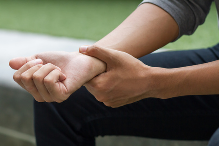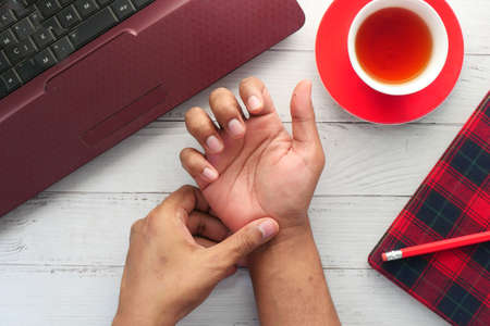 Close up man holding her wrist symptomatic Office Syndrome.