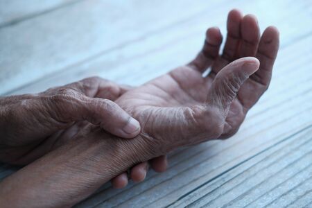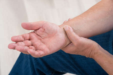 Close up of senior women hand suffering wrist pain