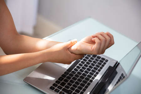Arthritis person, finger woman ache from working in office. Concept office syndrome hand pain from occupational disease, woman having wrist pain from using laptop computer, wrist pain.