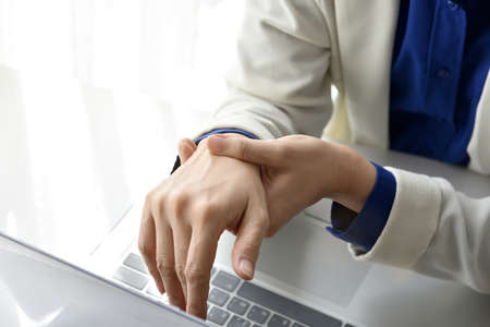Female suffer from wrist pain massage hand, work in office, close-up. Carpal tunnel syndrome, long-term use of keyboard