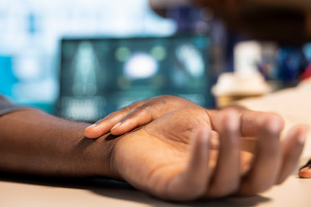 African american medic uses her smartwatch to measure pulse of a male patient, modern digital gadgets at the routine checkup. Heartbeat measurement with a fitness tracker accessory. Close up.
