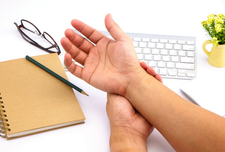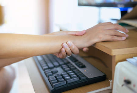 A person is holding on to the wrist, which comes from pain from work, pain from sitting and typing at a computer for a long time, causing pain in many areas of the body. Office Syndrome concept.