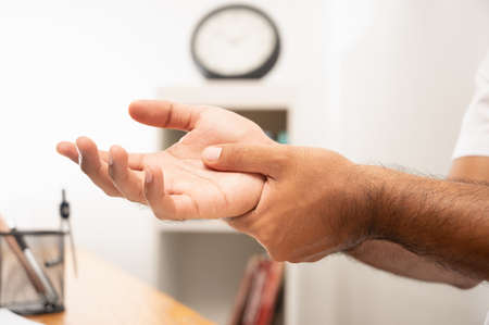 Close up male hand get hurt and pain in hand, wrist. Symptom office syndrome. He has symptom stress in his hand stiffness causing inconvenience.