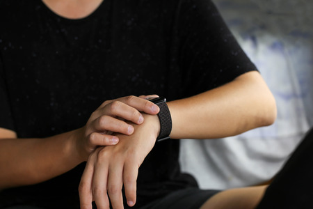 Man looking at his watch on his hand, watching the time using for concept Be Late For Something Day.