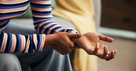 Woman, hands and wrist pain on sofa in home for arthritis, inflammation and strain from injury. Closeup, person and massage joint in lounge for muscle relief, osteoporosis tension and cramp recovery