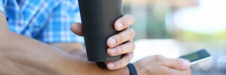 Millennial man hold smartphone with coffee cup