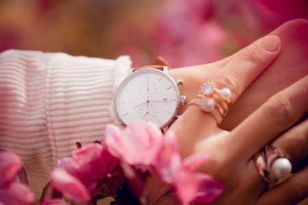 close up fashion details, young business woman holding her golden watch. graded in warm colors.