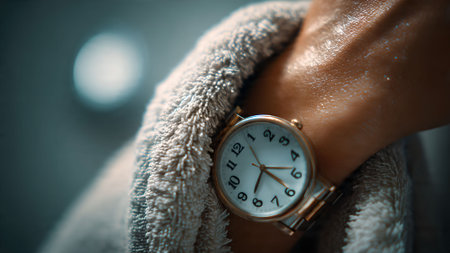 Close-up of a sweaty wrist with an analog watch after a workout. Concept of time, fitness, and healthy lifestyle.