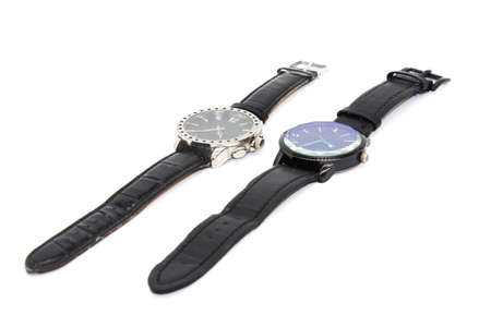 Men accessories on white background. Closeup at luxury men watch with black dial and leather strap.
