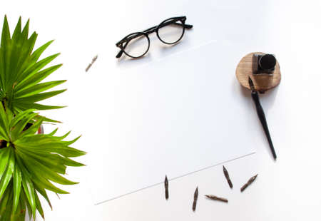 Black ink and ink bottle and green plant, white sheetmocup and ink pen on a white background; top view, flat lay; overhead view