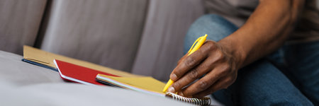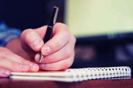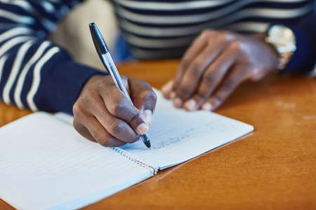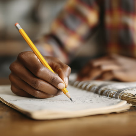 Young hand writes on notebook, absorbed in thought and feeling inspired, documenting ideas with energy