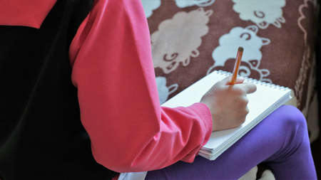 partially visible girl in home clothes sitting on the bed making notes in a notebook with a pencil, doing homework in a cozy room, homeschooling during quarantine and distance education