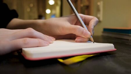 Close-up of woman writing something in notebook in cafe. Concept. Woman writes down something personal or plans day in cozy cafe.