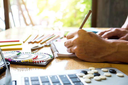 man write pen on notebook and work on laptop, a man relax working from home using notebook computer and camera, businessman planning business at his workplace and search data by laptop and internet