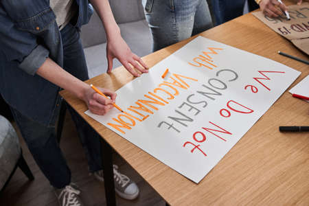Broker presents about Covid insurance. Wood texts on the documents. Medium close up shot with copy space.